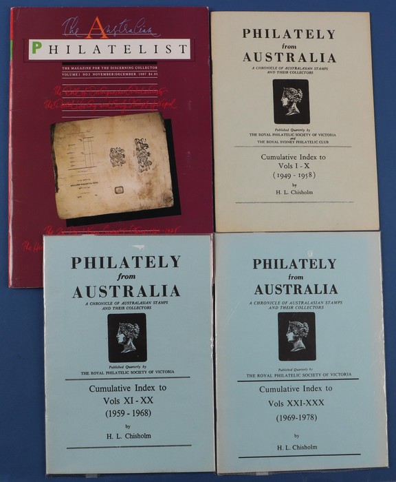 Australia Cumulative Index for Vols I-X (1949-58), XI-XX (1959-68) & XXI-XXX (1969-78). Also Australian Philatelist Vol 1 No 2, Nov 1987. (4) (Image1)