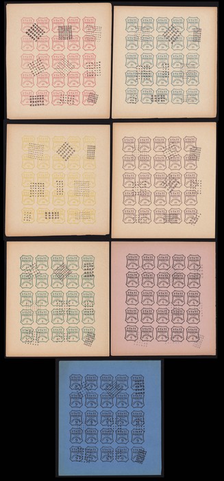 5c green, 6c on rose, 9c on blue, 10c brown, 20c blue, 40c red & 80c yellow, all early 1890s Spiro forgeries in comp sheets of 25. 'VFU' with various dotted 'pmks'. SG ex 27-36 (6c & 9c unlisted) would cat £230,000+ if genuine. Great reference