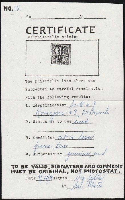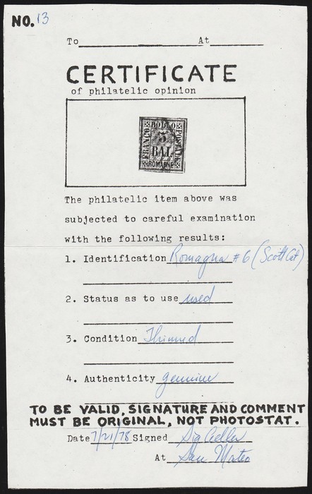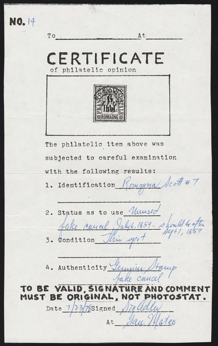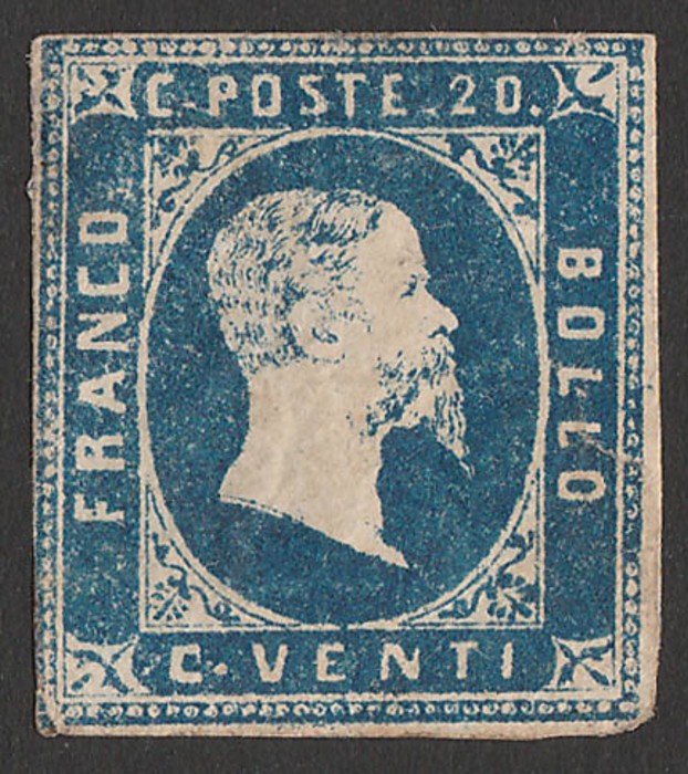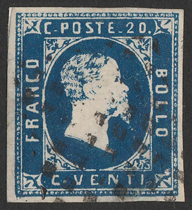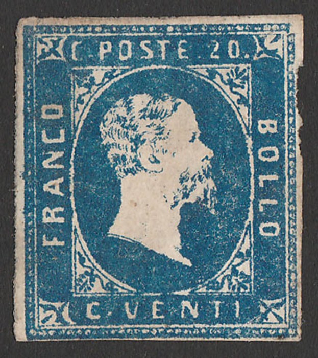 Embossed 20c blue on coloured paper. VF U appearance with 'Torino Apr 54' cds, thins, 4 large margins. SG 10 cat £275. Sass 5 cat €400. (Image1)
