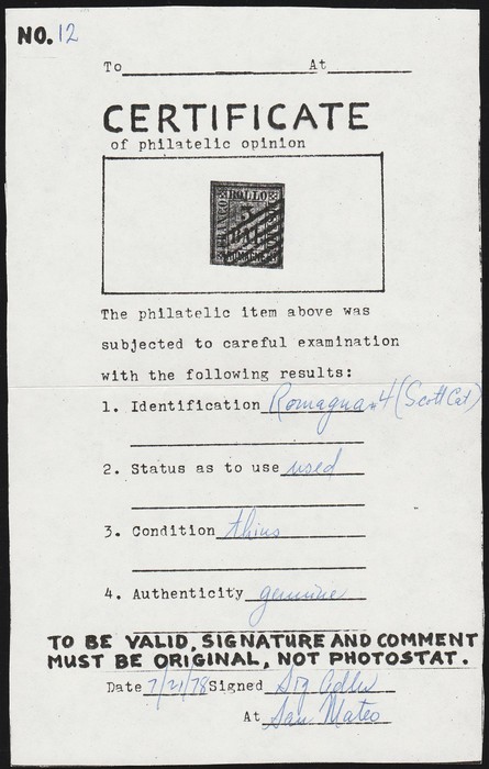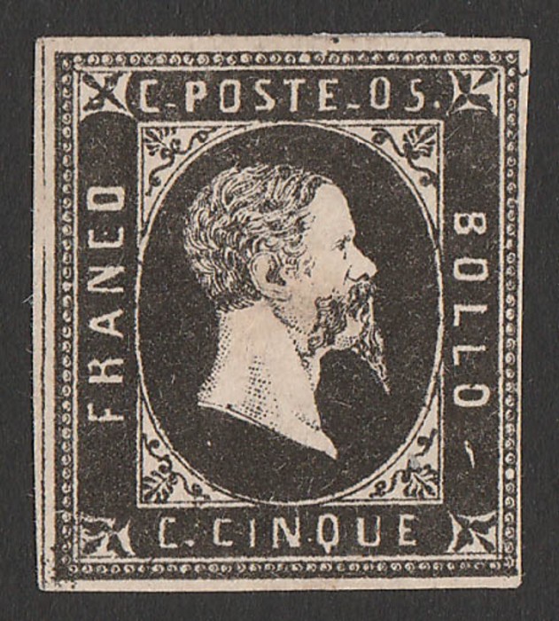 Embossed 5c blue-green, on coloured paper. F-VF U with '1 Apr 54' cds, 3½ margins. SG 9 cat £1400. Sass 4 cat €2500. Rare genuine. (P) (Image1)