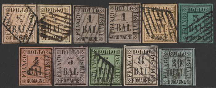 type-set set ½b-20b, plus ½b & 1b listed shades. F-VF U, few imperfections, all barred diamond pmks, 3-4 margins. SG 1-10 cat £20,000+ = A$40,000. Sass 1-9 cat €27,800 = A$46,000. Extremely rare genuine used set. With 5 certs