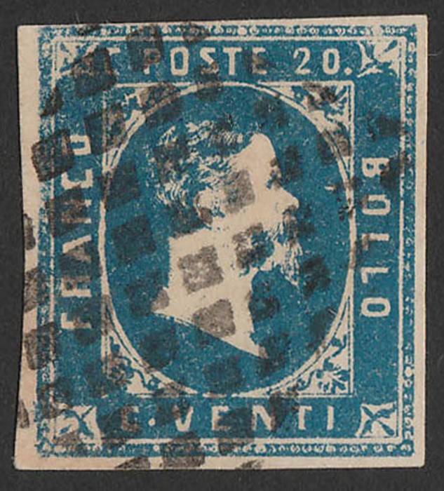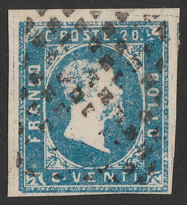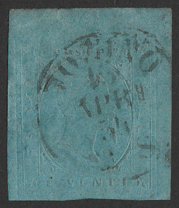 20c blue. VF U, 4 large margins, dotted pmk. SG 3 cat £325. Sass 2 cat €550. (P) (Image1)