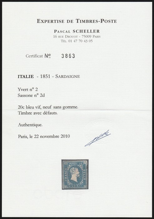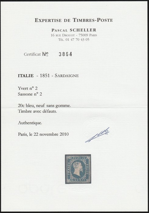 20c blue. Fresh UN, thins etc, 3½ margins. Scott 2 cat US$9500, SG 3 cat £13,000. Sass 2 cat €26,000 for M. Very rare in genuine unused condition. 2020 Scheller photo cert. (P) (Image1) (Image2)