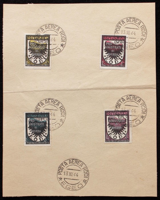 1944 German Occup War Victims Airmail opt set 50c+2L - 5L+2L. Superb U on large piece with 'POSTA AEREA 13.10.44 AEGEO' cds. SG 232-235 cat £150+, Sass PA 56-59 cat €180+ as loose stamps, plus premium for such nice piece. (Image1)