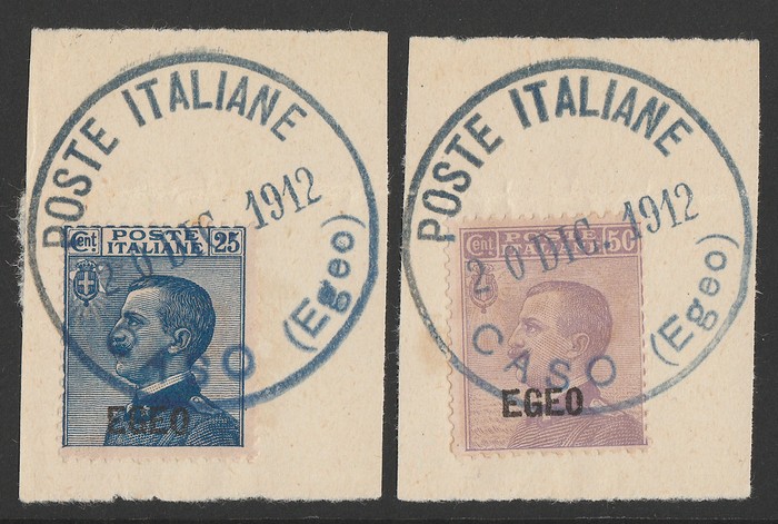 Caso: 1912 'EGEO' opt King set 25c blue & 50c violet. VFU, on piece with 'Poste Italiane 20 DIC 1912 Caso (Egeo)' cds. SG 1-2 cat £88+, Sass 1-2 cat €120+, plus premium for pmks. (2) (Image1)