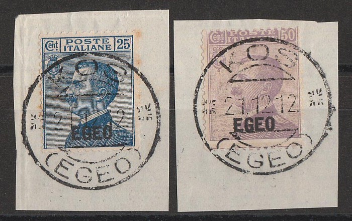 Kos: 1912 'EGEO' opt King set 25c blue & 50c violet. VFU, on piece with 'Kos 21.12.12 Egeo' cds. SG 1-2 cat £88+, Sass 1-2 cat €120+, plus premium for pmks. (2)
