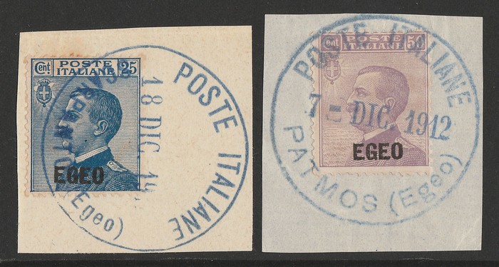 Patmos & Scarpanto: 1912 'EGEO' opt King set 25c blue & 50c violet. VFU, on pieces with 'Poste Italiane 18 DIC 1912 Scarpanto (Egeo)' & Poste Italiane 7 DIC 1912 Patmos (Egeo)' cds. SG 1-2 cat £88+, Sass 1-2 cat €120+, plus premium for