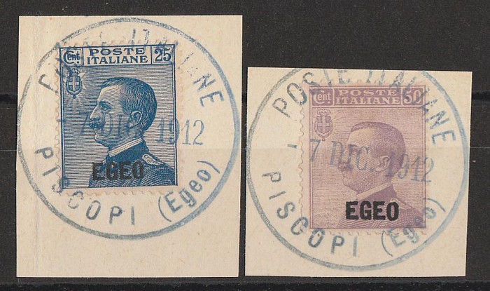 Piscopi: 1912 'EGEO' opt King set 25c blue & 50c violet. VFU, on piece with 'Poste Italiane 7 DIC 1912 Piscopi (Egeo)' cds. SG 1-2 cat £88+, Sass 1-2 cat €120+, plus premium for pmks. (2) (Image1)