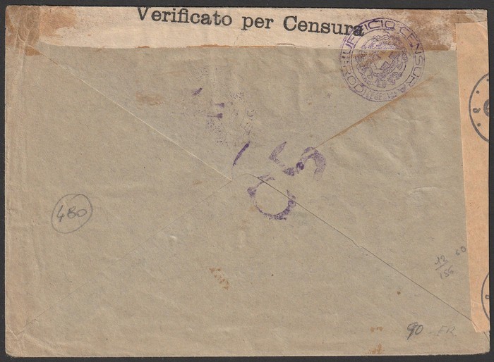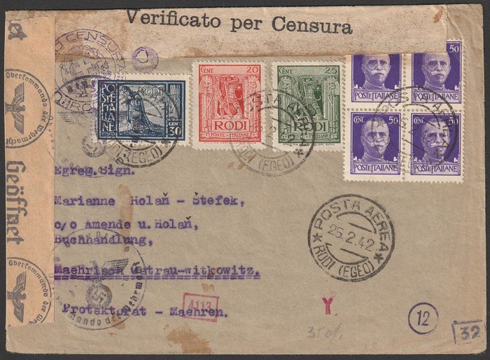 Censored cover franked Italy King 50c blk of 4 & Rodi 20c, 25c & 30c Pics all tied by 'Posta Aerea Rodi (Egeo) 25 2 42' cds, with German & Italian censor tapes & h/s. SG 19-21B & 247. Rare mixed franking. (P) (Image1) (Image2)