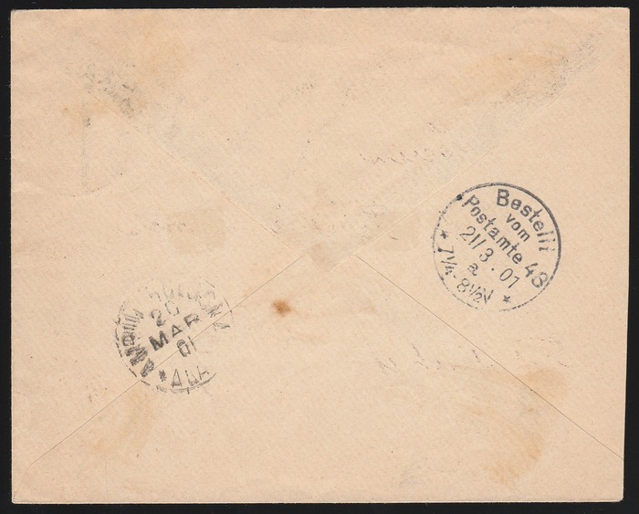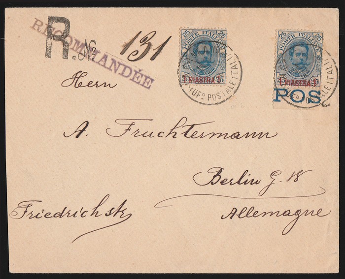 Registered cover franked Umberto 1Pi/25c blue (2), tied by 'La Canea Of Postale Italiano 11 3 01' cds, to Germany with 'Bologna' transit & German arrival b/s. SG 1 cat £200++, Sass 1 cat €220++, both for loose stamps, cat €2750+ on