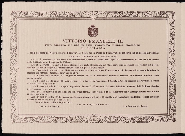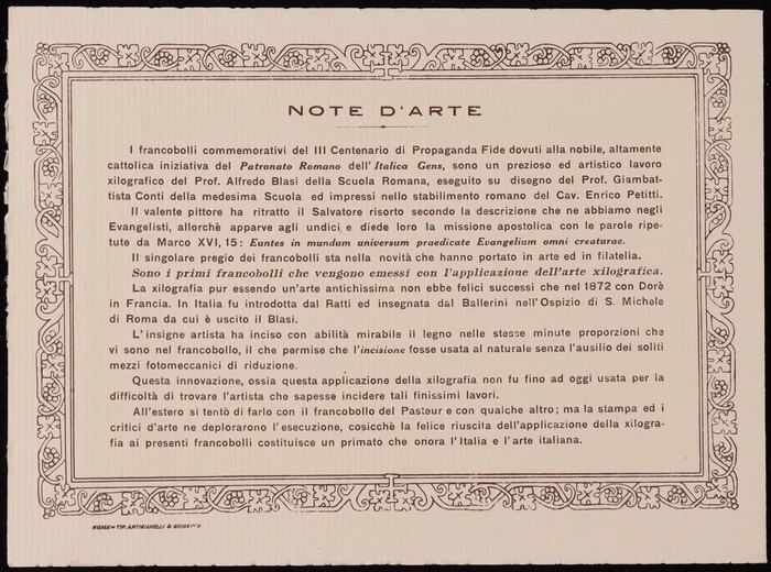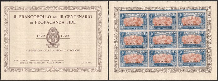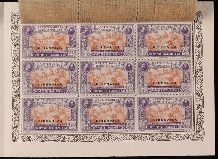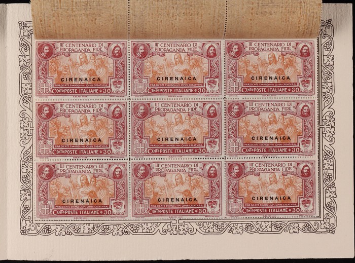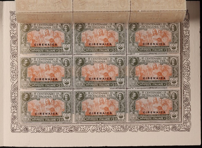 Tercentenary of Congregation set 20c-1L 'Di Propaganda Fide' in special official presentation booklet with opt blks of 9 of ea value attached by to selvedge. Superb fresh MNH. SG 1-4. Sass 1-4 cat €1350+ as loose stamps, plus premium for rare