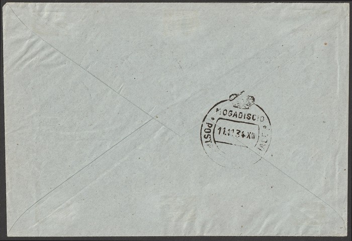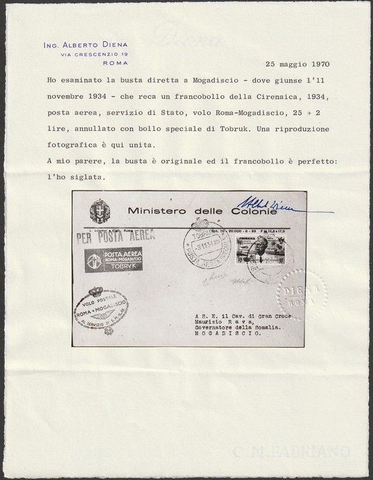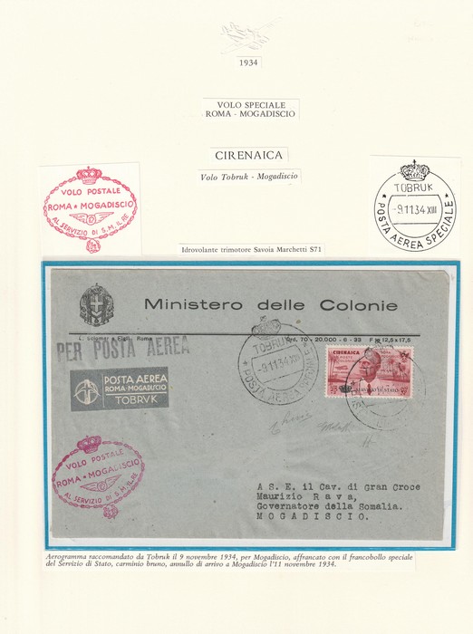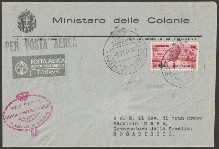 Rome-Mogadiscio intermediate FFC Cyrenaica-Somalia Official 'Ministero delle Colonie' franked Rome-Mogadiscio 25L-5L opt 'SERVICIO DI STATO', tied by 'Tobruk 9 11 34' cds, with special Airmail label & red flight cachet, Mogadiscio arrival b/s.