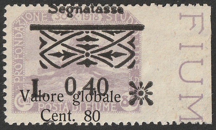 Due 40c on Valore Globale large opt 80c pale violet, error IMPERF between stamp & right margin - also both opts shifted. VF fresh MLH. SG D198(var) normal cat £950++, plus premium for varieties. Sass S32Y cat €4400. Extremely rare, only 1