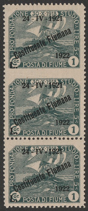 Constitution opt 1 Cor grey vert strip of 3, error IMPERF horiz between top 2 stamps. Superb fresh MLH/MNH. SG 197(var). Sass 186u cat €380++, plus premium for se-tenant combination. 2024 Ceremuga AIEP photo-cert. (P) (Image1)