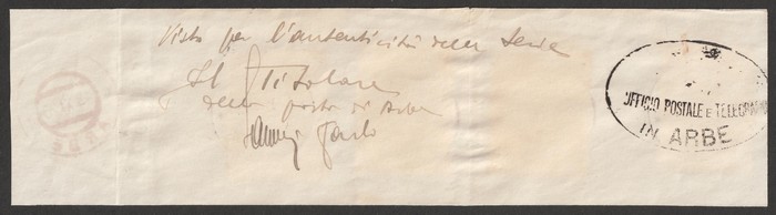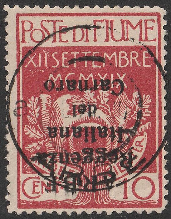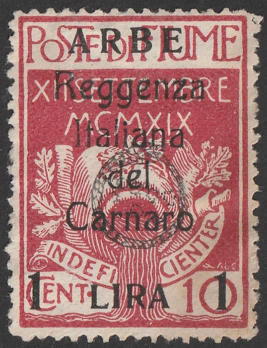 small ARBE opt 10c red error whole opt INVERTED. VFU with 'Arbe 8 X 20' cds. SG 2B(var). Sass 6a cat €700. Very rare probably as only 2 rows printed. (P) (Image1)