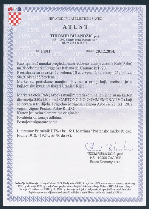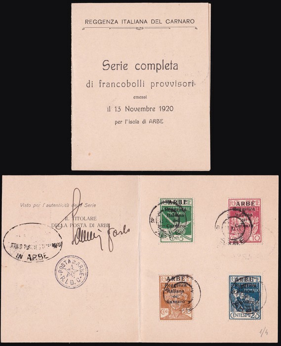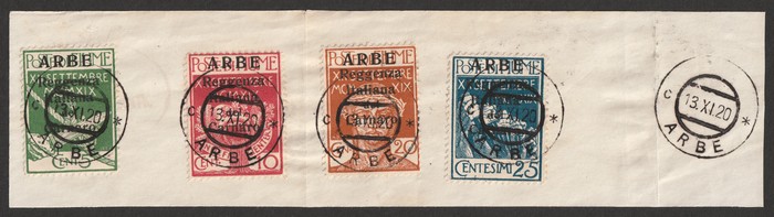 large 'ARBE' opt set 5c-25c, all tied by '13 XI 21 Arbe' cds, in official PO printed presentation folder with PO cachets & signature. VFU. Scott 122a-25a cat US$2100++. SG 1A-4A cat £1175++, Sass 1-4 cat €1600++, both for loose stamps &