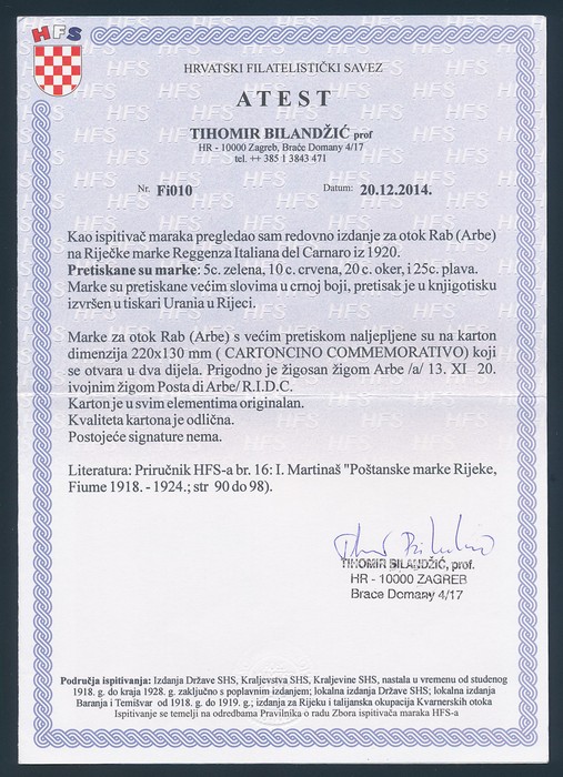 large ARBE opt set 5c-25c. Superb U, tied to piece by 'ARBE 13 XI 20' cds, reverse with 'Ufficio Postale e Telegrafice in Arbe' official h/s plus m/s guarantee of postal official. Scott 122a-25a cat US$1120+, SG 1A-4A cat £1175+. Sass 1-4 cat