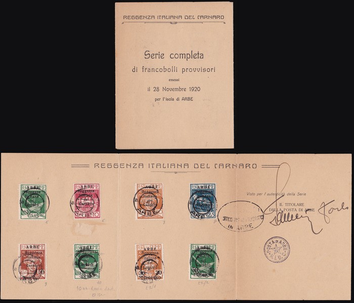 small 'ARBE' opt set 5c-55/5c, plus Express 30/20c & 50/5c (55/5c variety double perf - Sass 10na), tied by '28 XI 20 Arbe'' cds in official PO printed presentation folder with PO cachets & signature. VFU. SG 1b-6 & E7-8 cat £607++, Sass 5-10 &