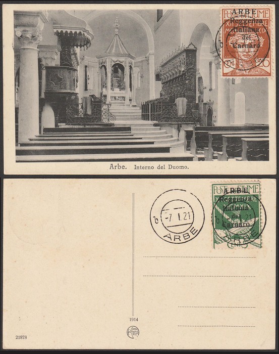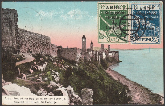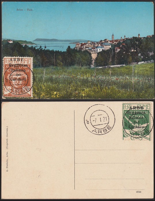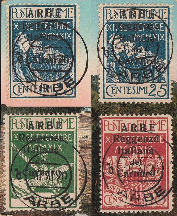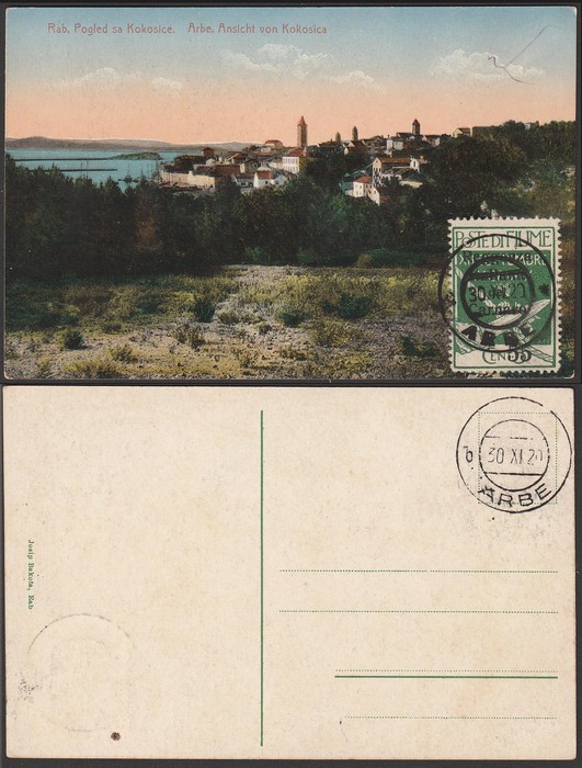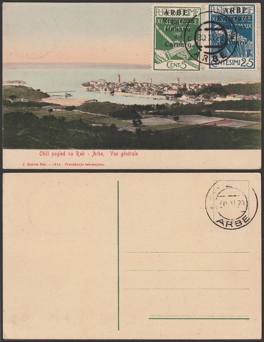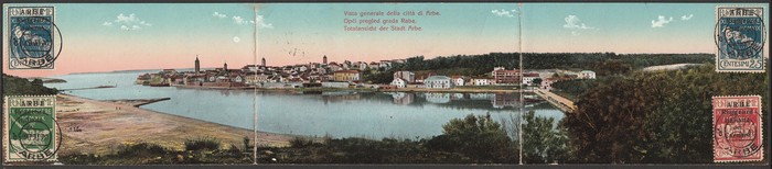 small 'ARBE' opt 5c green, 10c red, & 25c blue (2) tied to tri-fold colour panoramic PPC of Arbe by 'Arbe 30 XI 20' cds. VF. SG 1B, 2B & 4B cat £167++. Sass 5, 6, & 8 cat €300++ - both as loose stamps, plus premium on card. (P) (Image1) (Image2)