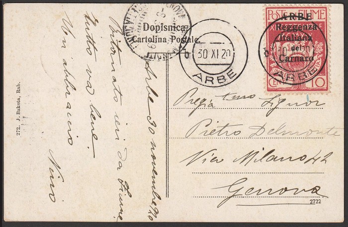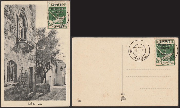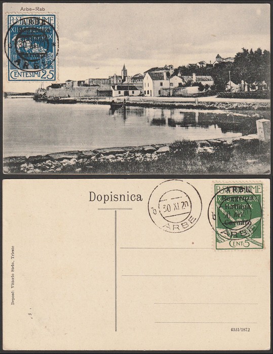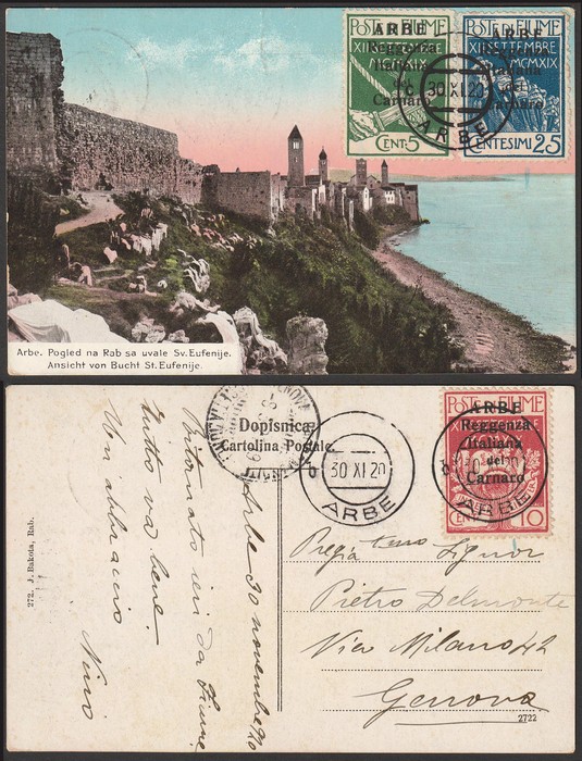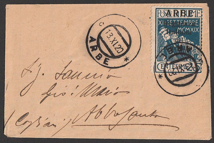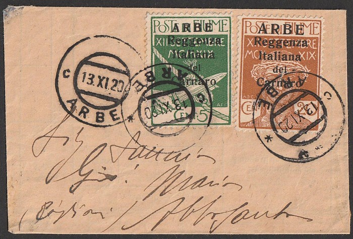 small 'ARBE' opt 5c, 10c & 25c (2 on view side) tied by 'Arbe 30 XI 20' cds, to Genova with arrival cds. VFU. SG 1B, 2B & 4B cat £117++. Sass 5, 6 & 8 cat €85++ -both as loose stamps, plus large premium on card from postal usage. (P) (Image1) (Image2)