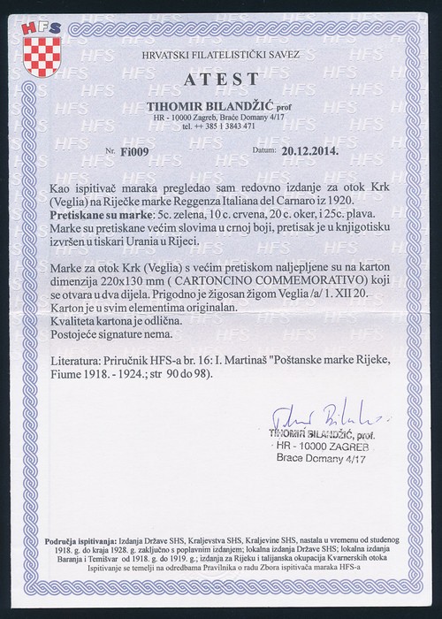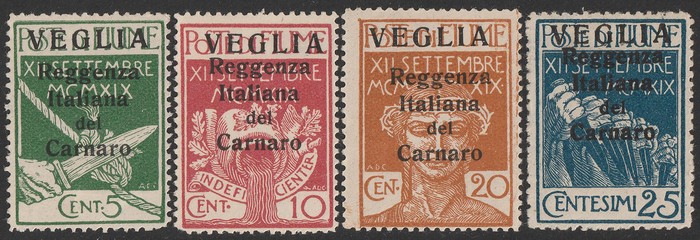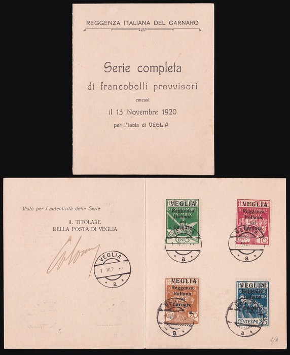1920 large 'VEGLIA' opt set 5c-25c, tied by 'Veglia XII 20'' cds in official PO printed presentation folder with PO cachets & signature. VFU. Scott 128a-31a cat US$2075+. SG 1A-4A cat £1175+, Sass 1-4 cat €1600+, both for loose stamps &