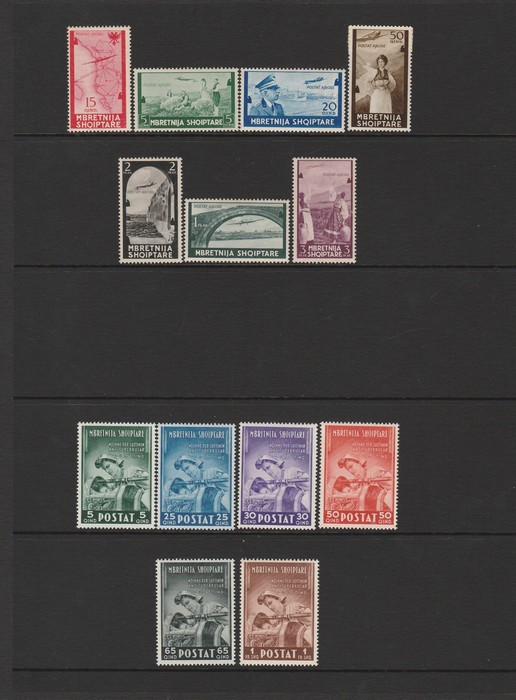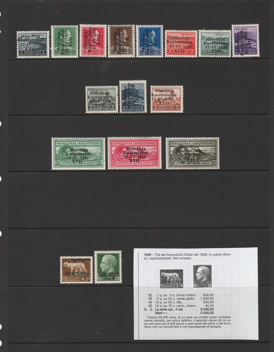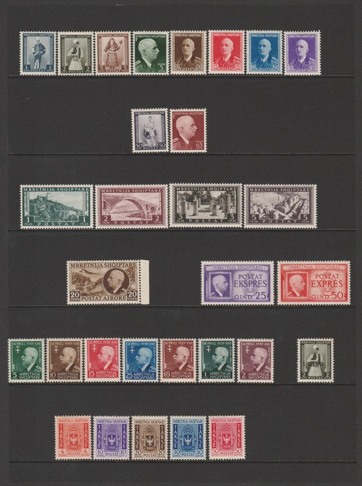 collection inc 1939 'Mbledhja Kushtetuese' opt set to 5Fr, plus Airmails, 1940 'Regno d'Albania Mbretnia Shqiptare' very rare unissued opts on Italy special printings 1a/5c dark brown (€650), 5a/25c yellow-green (cat €1300). 1939-40 King