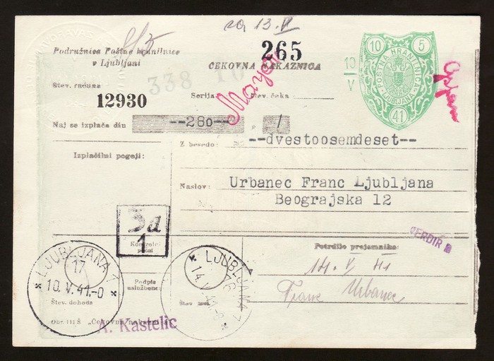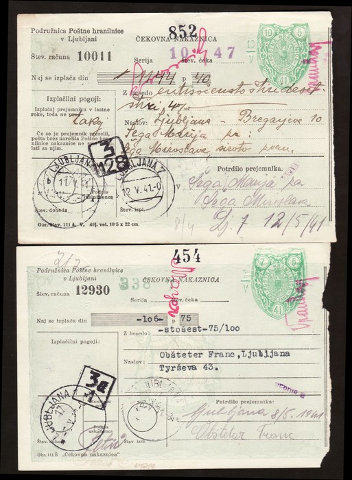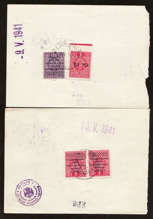 Yugoslavia Postal Money Orders with green fiscals dated 1941 imprint with 'Ljubljana/Lubiana' 1941 cds, for amounts of 106L75, 280L & 1144.40L. Each with 'CoCi' opt Postage Dues 50p(2) or 1D(4) tied by similar cds. Sass S2, 56 & 57 cat €77+ as