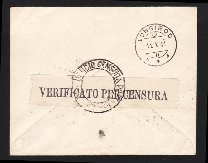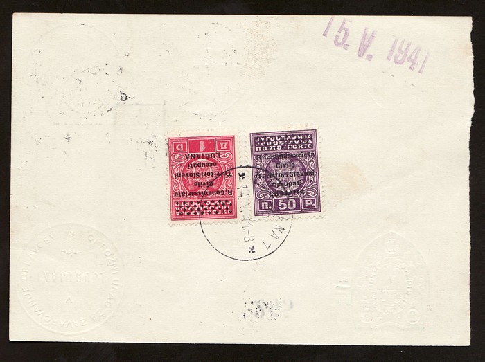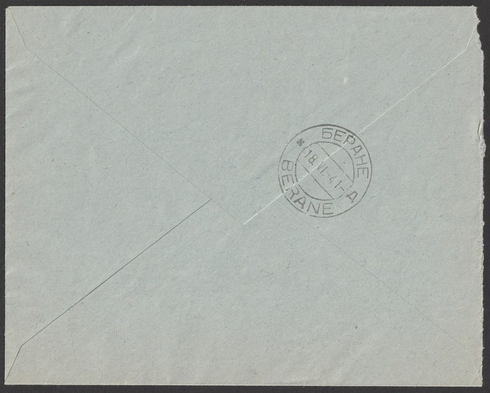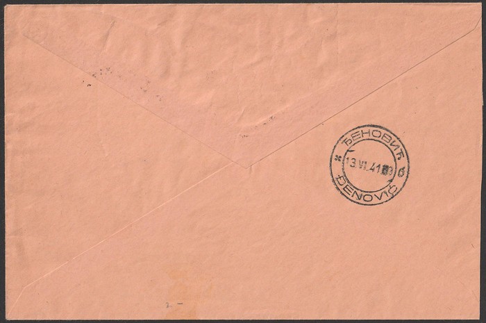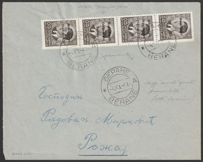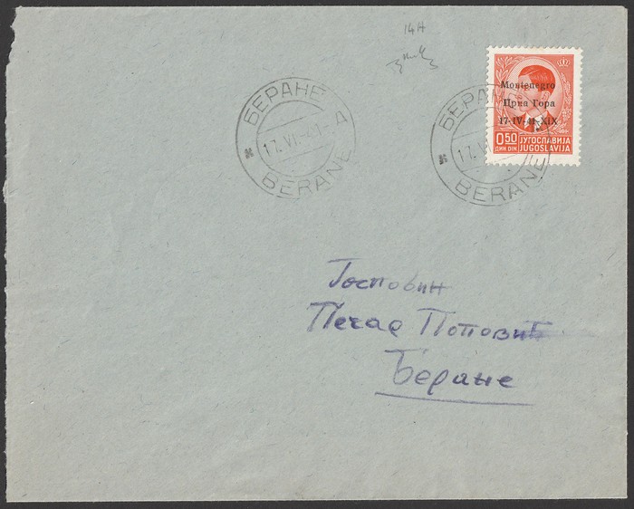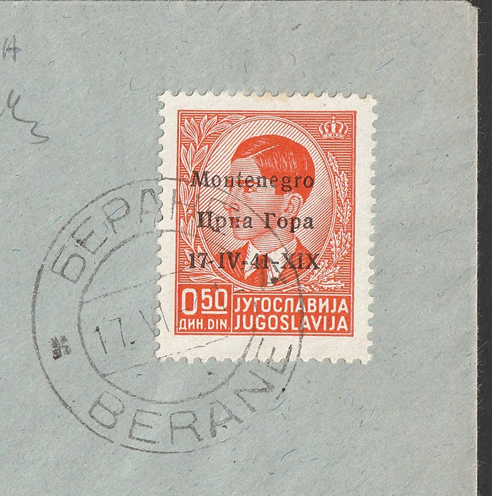 3-line bilingual opt King 0.50D orange unissued value, on local cover tied by 'Berane 17 VI 41' with 'Berane 18.VI.41' arrival b/s. SG unlisted. Sass 14A cat €3500 as loose stamps & cat €7000 on philatelic cover. Only 1 sheet printed &
