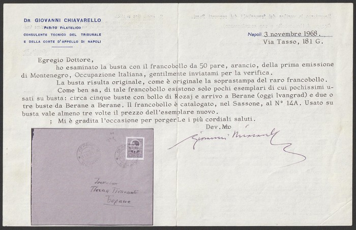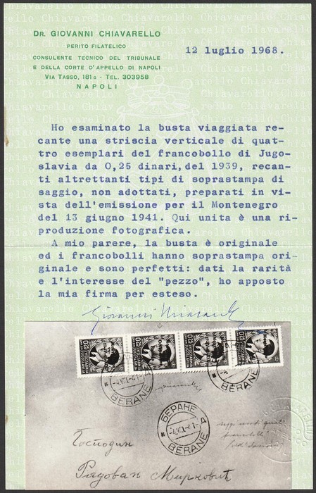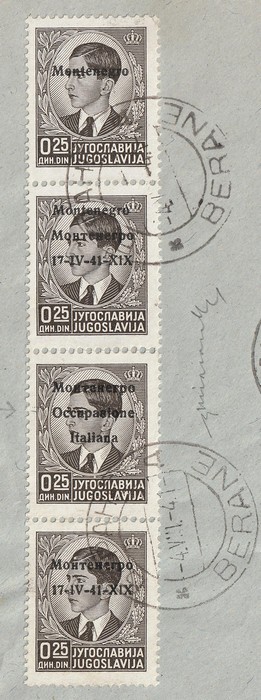 of normal z & 4th with 2-line Cyrillic 'Montenegro 17-IV-41-XIX' opt, on cover tied by 'Berane 4.VIII.41' cds, to Rozaj with b/s. SG 1(var). Sass 1P(var) cat €2500 as loose stamps while on cover is unpriced. Dr Chiavarello photo cert. (P) (Image1) (Image2)