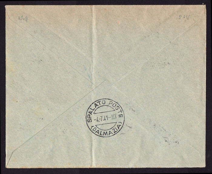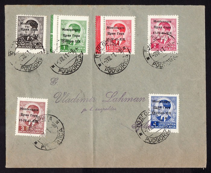 bilingual 3-line opt Kings 25c-4D on cover, tied by 'Podgorica 2.VII.41' cds to Italy with 'Spalato Poste (Dalmazia) 4.7.41' cds. SG 1-6. Sass 1-6 cat €84+ as loose stamps & €210 for this franking. (Image1) (Image2)