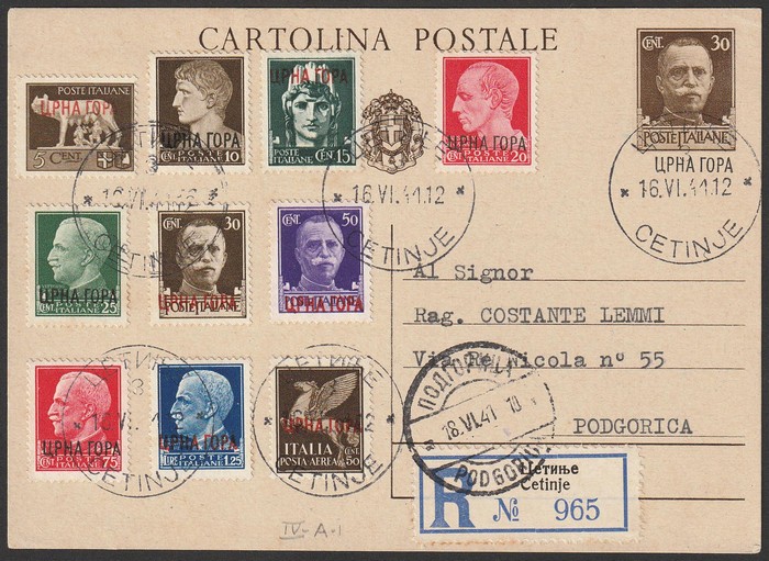 Registered use of 'CRNA GORA' opt Italy 30c brown Postcard, uprated opt set of 10, tied by 'Cetinje 16 VI 41' cds, to Podgorica with arrival cds. SG 28-37. Sass 15-23 & A9 cat €240 for set on cover, plus the card Interitalia P2 cat €175, so