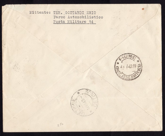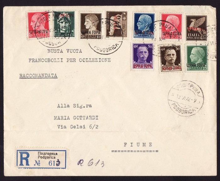 Registered cover (horiz fold at base) franked CRNA GORA opt set of 10, tied by 'Podgorica 12 VII 42' cds, to Italy with Fiume arrival b/s. SG 38-27. Sass 15-23 & A9 cat €240 for set on cover. Attractive. (Image1) (Image2)