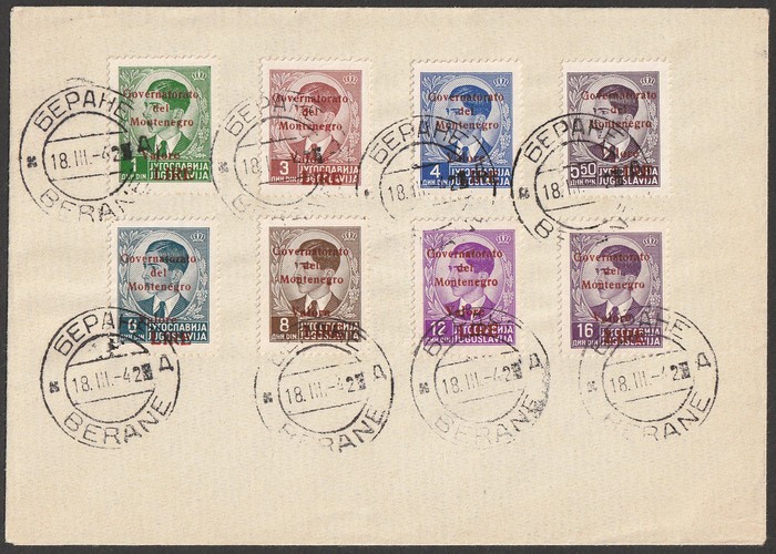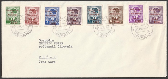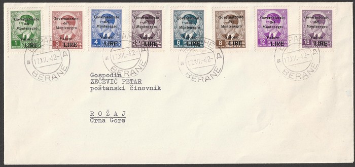 'Governatorato' 5-line red LIRE opt King vals 1D-16D (ex the 3 rare values), tied by 'Berane 18 III 42' cds on cover. SG ex 43A-51A. Sass ex 50-59 cat €560+ as loose stamps. (P) (Image1) (Image2)