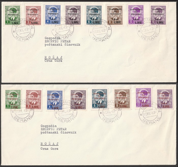 'Governatorato' 5-line 'LIRE' opt in red & black vals 1D-16D (ex 1.50D & 2D) tied to 2 covers by 'Berane 17 XII 42' cds, both to Razaj with arrival b/s. VFU. SG ex 43-51A/B. Sass 40-48 & 50-59 cat €1200+ as loose stamps alone. (16 on 2 covers).