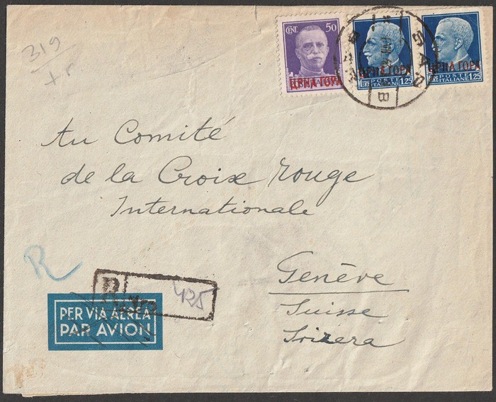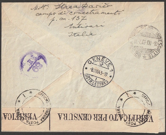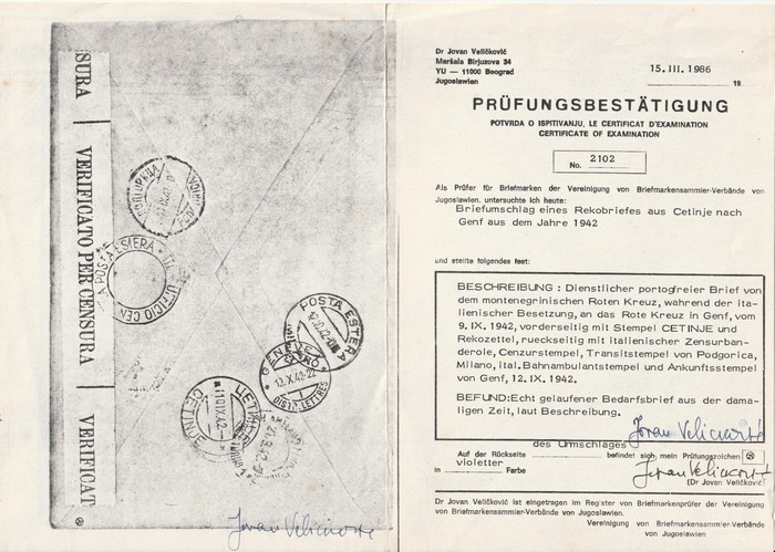 Stampless Registered Red Cross cover with 'Cetinje 9 IX 42' cds & 2 Red Cross cachets, to Switzerland with numerous b/s & censor tape. Extremely rare usage. Dr Velickovic AIEP cert. (P) (Image1) (Image2)