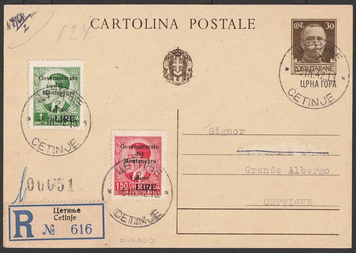 Registered use of 'CRNA GORA' Italy 30c brown Postcard, 'Govenatorato' 5-line LIRE opt King 1D green & 1.50D red tied by 'Cetinje 5 III 42' cds, as uprating. SG 43 & 44B. Sass 40 & 41 cat €530+ as loose stamps & €1200 for this franking,