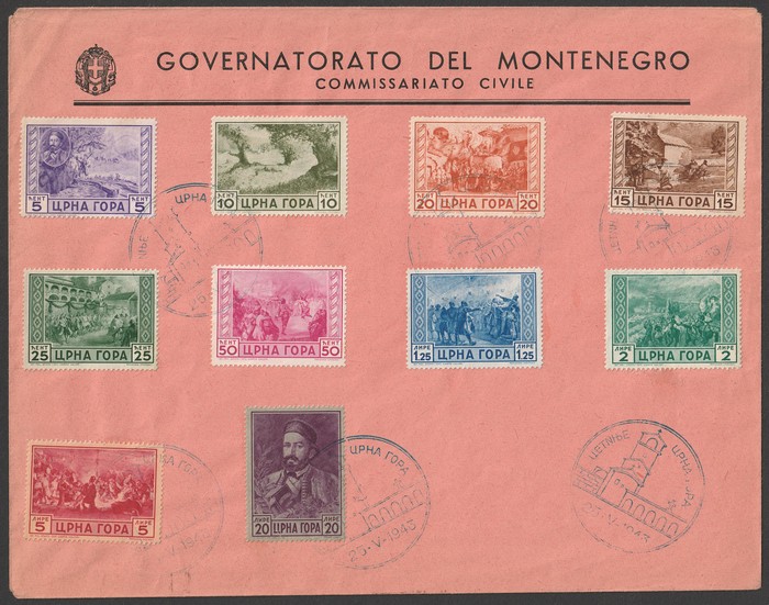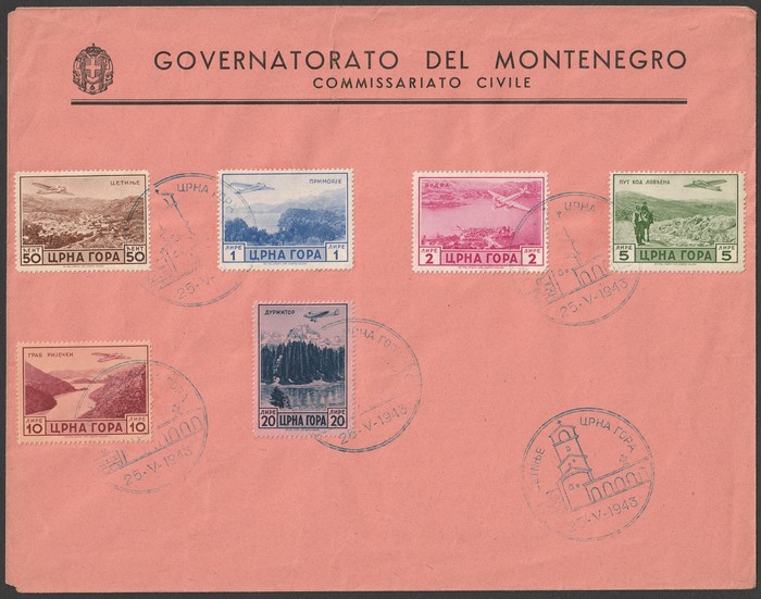 National Poem sets 5c-20L Postage & Airmail sets tied to Official envelopes by 'Cetinje 25 V 1943' violet pictorial cds. VFU. SG 60-75 cat £150+ as loose stamps. Sass 60-69 & PA26-31 cat €1300 for sets on covers. Very rare. 2024 Ceremuga