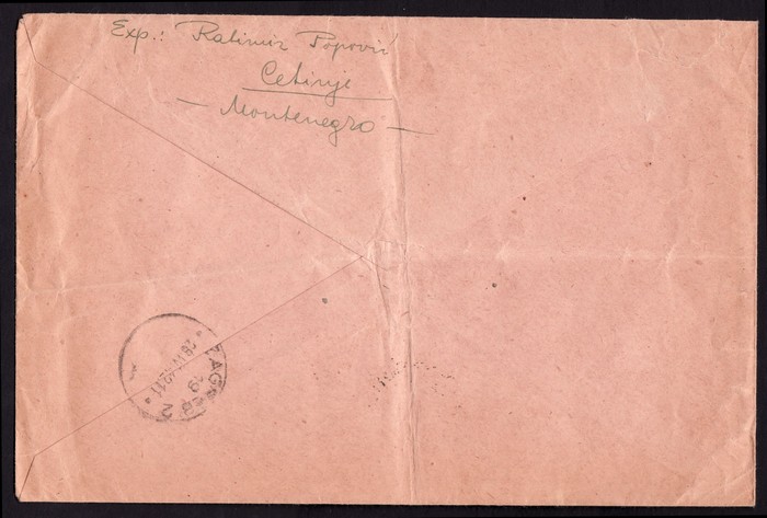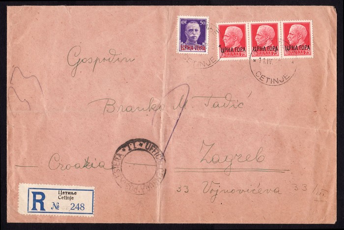 Registered cover (¼ folded) franked 'CRNA GORA' opt King 50c & 75c (3), tied by 'Cetinje 11.IV.42' cds, to Croatia with Zagreb arrival b/s. SG 34-35. Sass 21-22 cat €8+. Scarce proper usage. (Image1) (Image2)