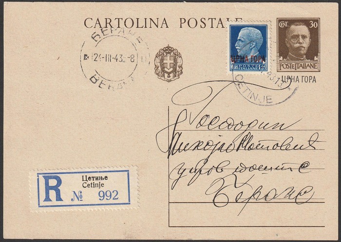 Registered use of 'CRNA GORA' opt Italy 30c brown Postcard, uprated same opt King 1.25L, tied by 'Cetinje 19 III 43' cds. SG 36. Sass 23 cat €70, both, plus the card. Interitalia P2 cat €175 = €240. (P) (Image1) (Image2)