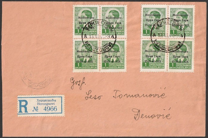 Registered cover franked bilingual 3-line opt King 1D green in 2 blks of 4 tied by 'Hercegnovi 13 VI 41' to Denovic with arrival b/s. SG 2. Sass 2 cat €84+ as loose stamps & €220 for this franking. (P) (Image1) (Image2)
