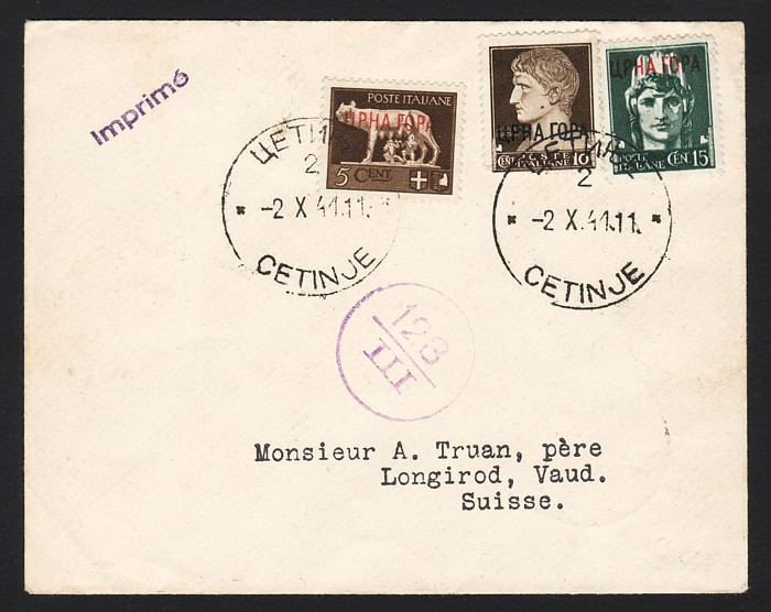 cover franked 'CRNA GORA' opt 5c, 10c & 15c tied by 'Cetinje 2.X.41' cds. To Switzerland with Longirod arrival b/s, with censor tape & cachet. SG 28-30. Sass 15-17 cat €80+. Scarce international usage. (Image1) (Image2)