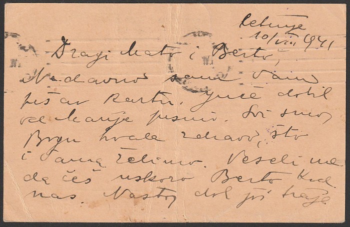 use of bilingual 3-line opt on Yugoslav 1D green Postcard (creased) uprated 'CRNA GORA' opt 15c pr, tied by 'Cetinje' machine cancel, with Censor cachet to Tuzla in Croatia. SG 30. Sass 17 cat €76, plus the card Interitalia P1 cat €175 =