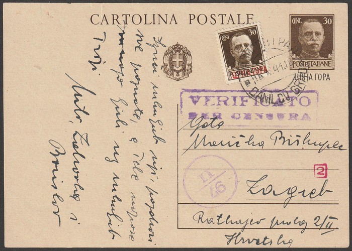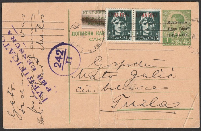 use of 'CRNA GORA' opt Italy 30c brown Postcard uprated opt King 30c tied by 'Danilov-Grad 15.X.41' cds to Croatia with censor cachets. SG 33. Sass 20 cat €70+, plus the card Interitalia P2 cat €175, total €245. Rare usage. (P) (Image1) (Image2)