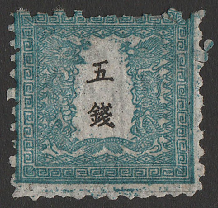 blue-green, rough perf, on native laid paper. F-VF UN. Sc 8 cat US$825. SG 22 cat £650. Sak 8 cat Y130,000 + A$1450. Rare genuine. (P) (Image1)