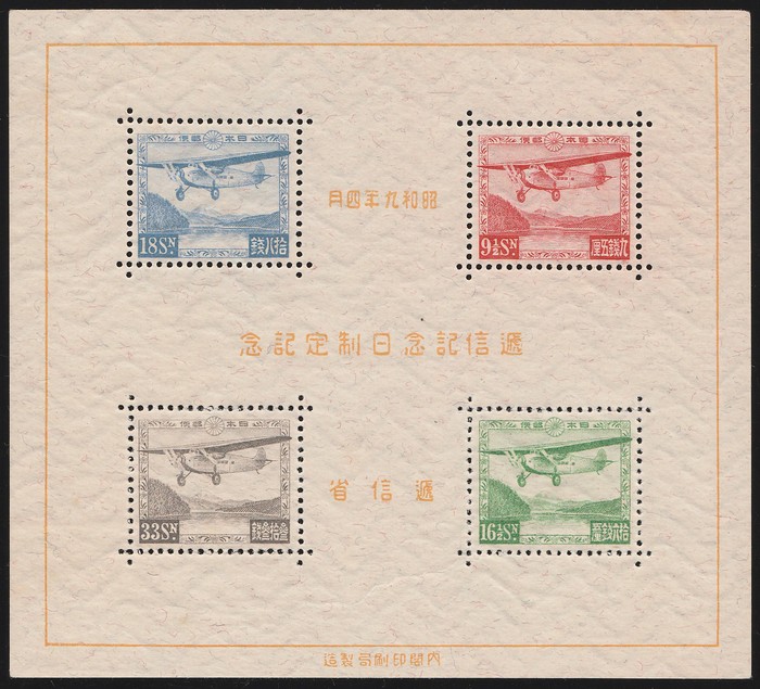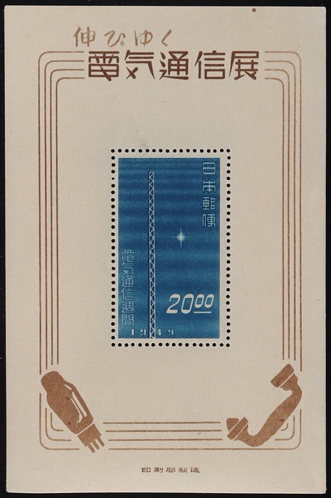 Communication M/Sheet, size 110x100mm. VF fresh M in marg & stamps MNH, gum sl tropicalised but fresh appearance. Sc C8 cat US$1250. SG MS271 cat £1300. Sak C56 cat 230,000Y. The key M/S of Japan. (P) (Image1)