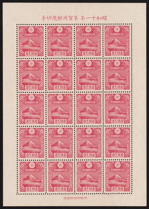 1½s carmine, full sheet of 20 with imprints etc. Superb fresh MNH with nice never hinged original gum. Sak N1A cat Y180,000 M, so est Y360,000 MNH. SG 280 footnote cat £600 for M sheet of 20, should be at least double, £1200 MNH.
