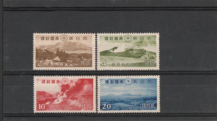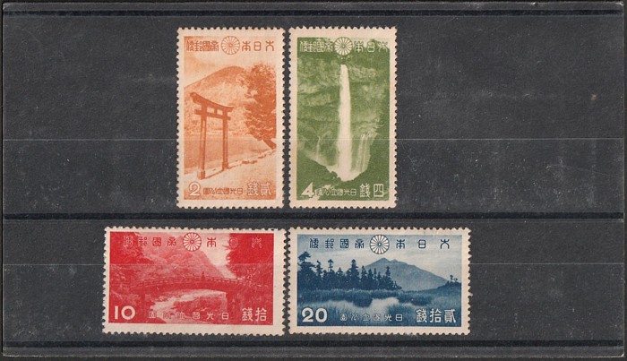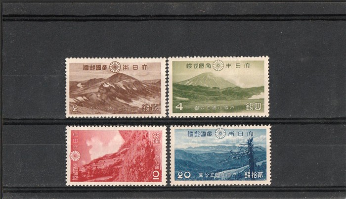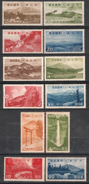 sets Nikko 2s-20s, 1939 Aso set 2s-20s, & 1940 Duisetsu-Zan set 2s-20s. VF fresh M/MLH. Scott 280-83, 290-93, 303-06 cat US$100. SG 340-43, 350-53, 363-66 cat £100. (12).