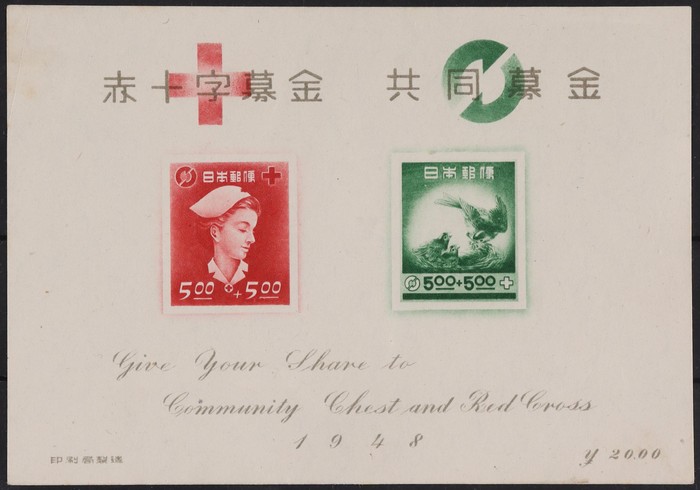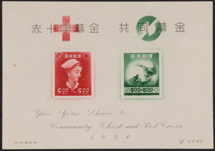 Community Chest set 5Y & 2Y50 red top marginal blk of 10 with inscription & 5Y + 2Y50 bright green, top & bottom marginal blk of 18 with inscriptions & imprint. VF fresh MNH. Sak C135-36 cat 112,000Y. SG 485-6 cat £700, plus premium for