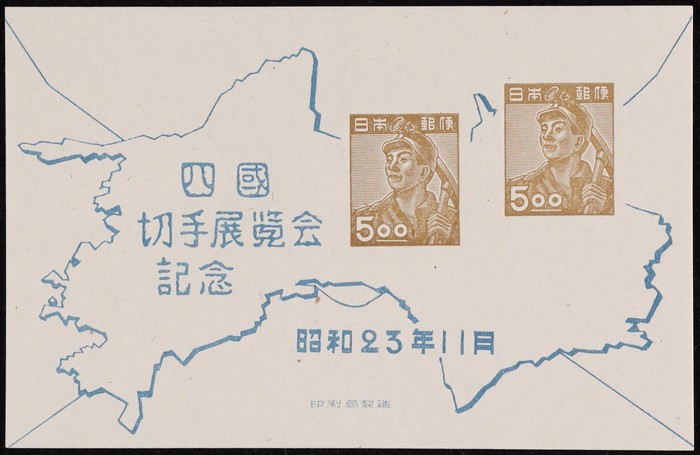 Exhib M/Sheet, with miner 5Y brown (2) imperf, 115x72mm. VF UN as issued. Sak C139 cat 10,000Y. SG MS513 cat £70. (Image1)