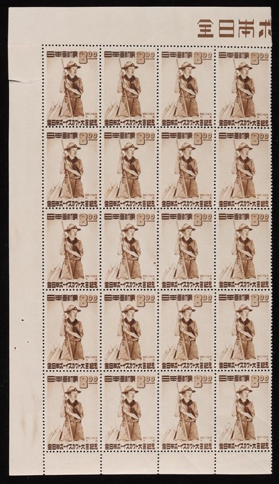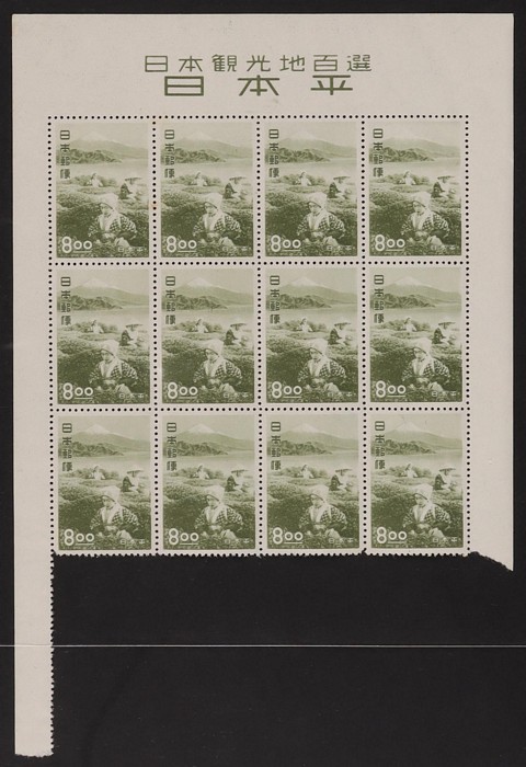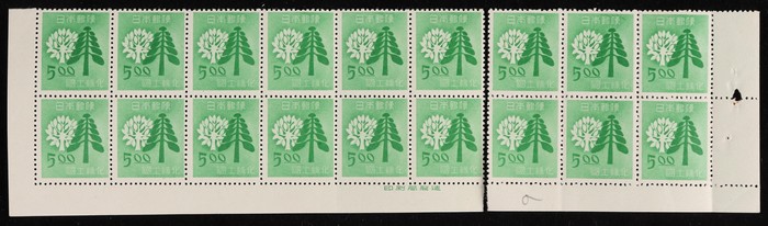 bright green LL cnr marginal imprint blk of 12 & LR cnr marginal blk of 6. VF fresh MNH. Sak C157 cat 46,800Y+. SG 525 cat £225+, plus premium for blks. (2 blks).